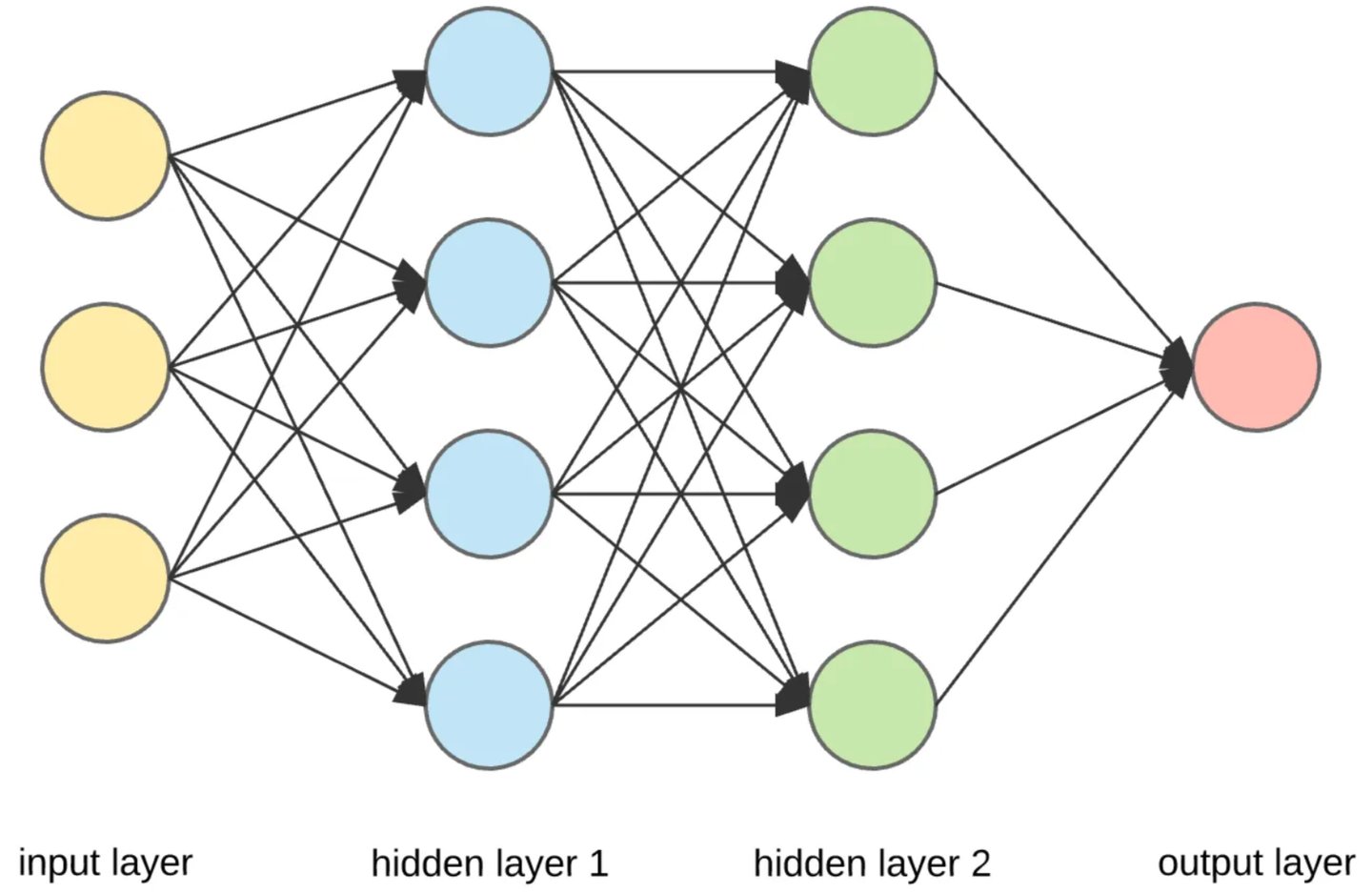 A graphical representation of ANN with 3 inputs, one output and 2 hidden layers.