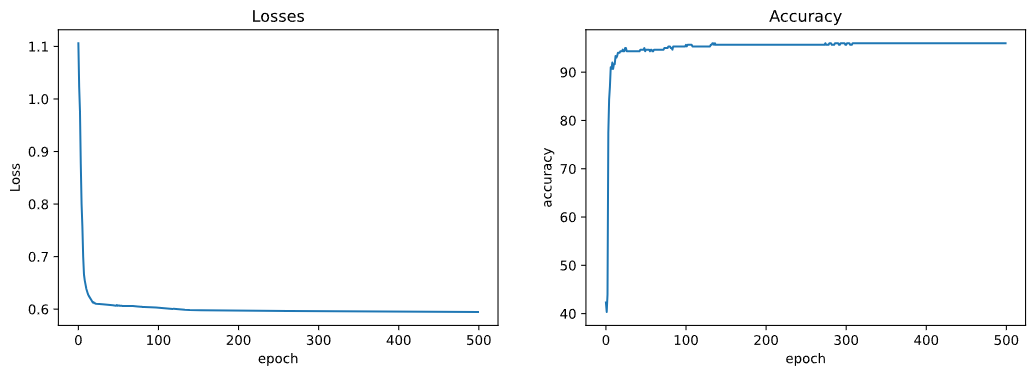 The fun part begins when we need to train the model using the following code. Here I programmed the model to educate himself for 500 times, record the losses and calculate the accuracy.