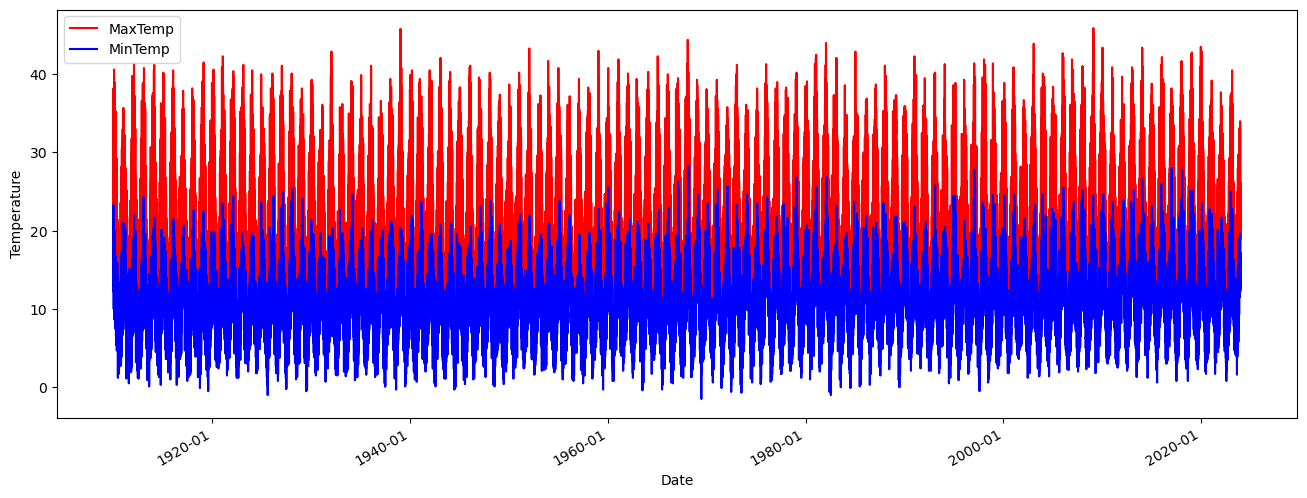Here is the attempt to plot the daily max and min temperature. The plot looks very crowded: